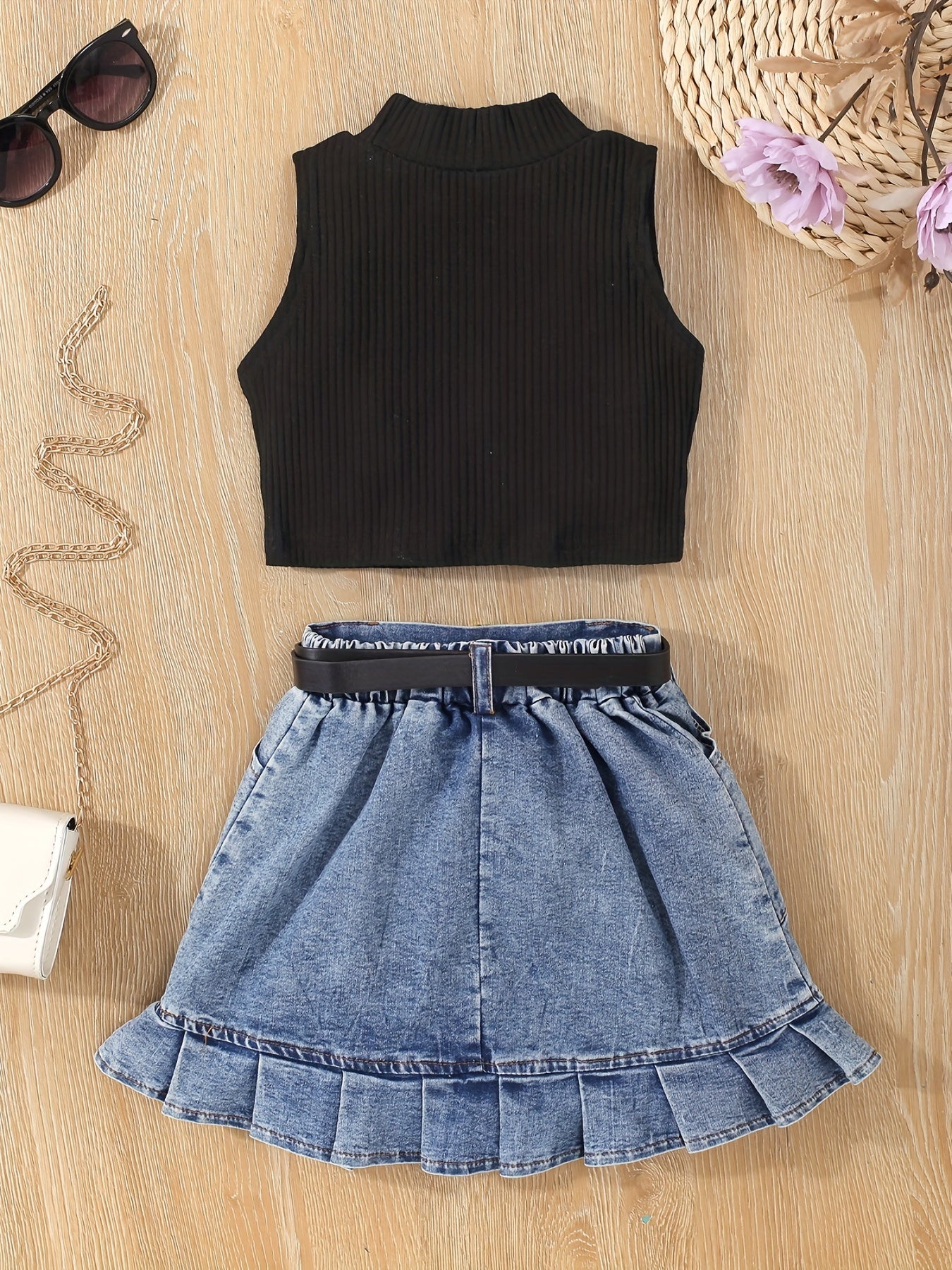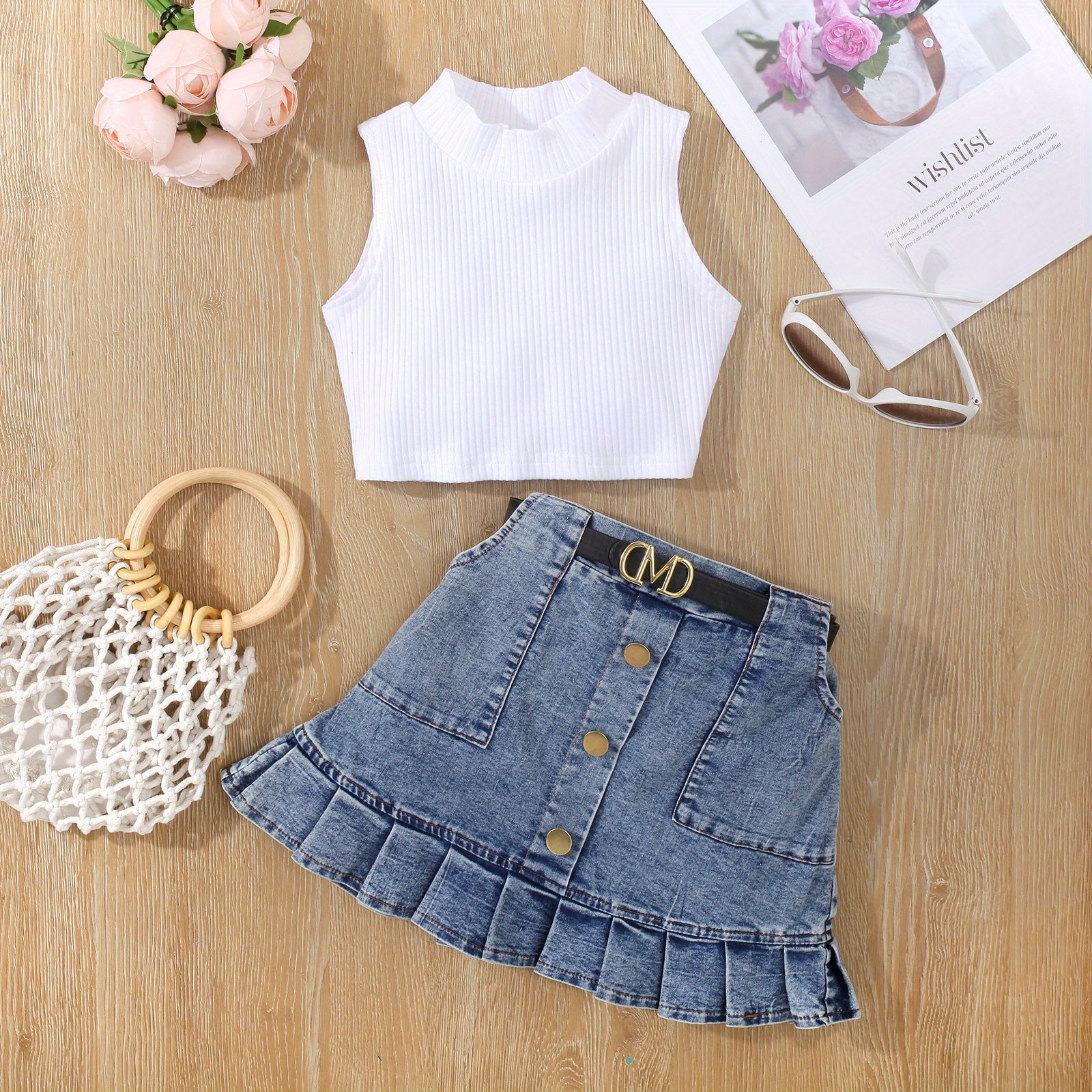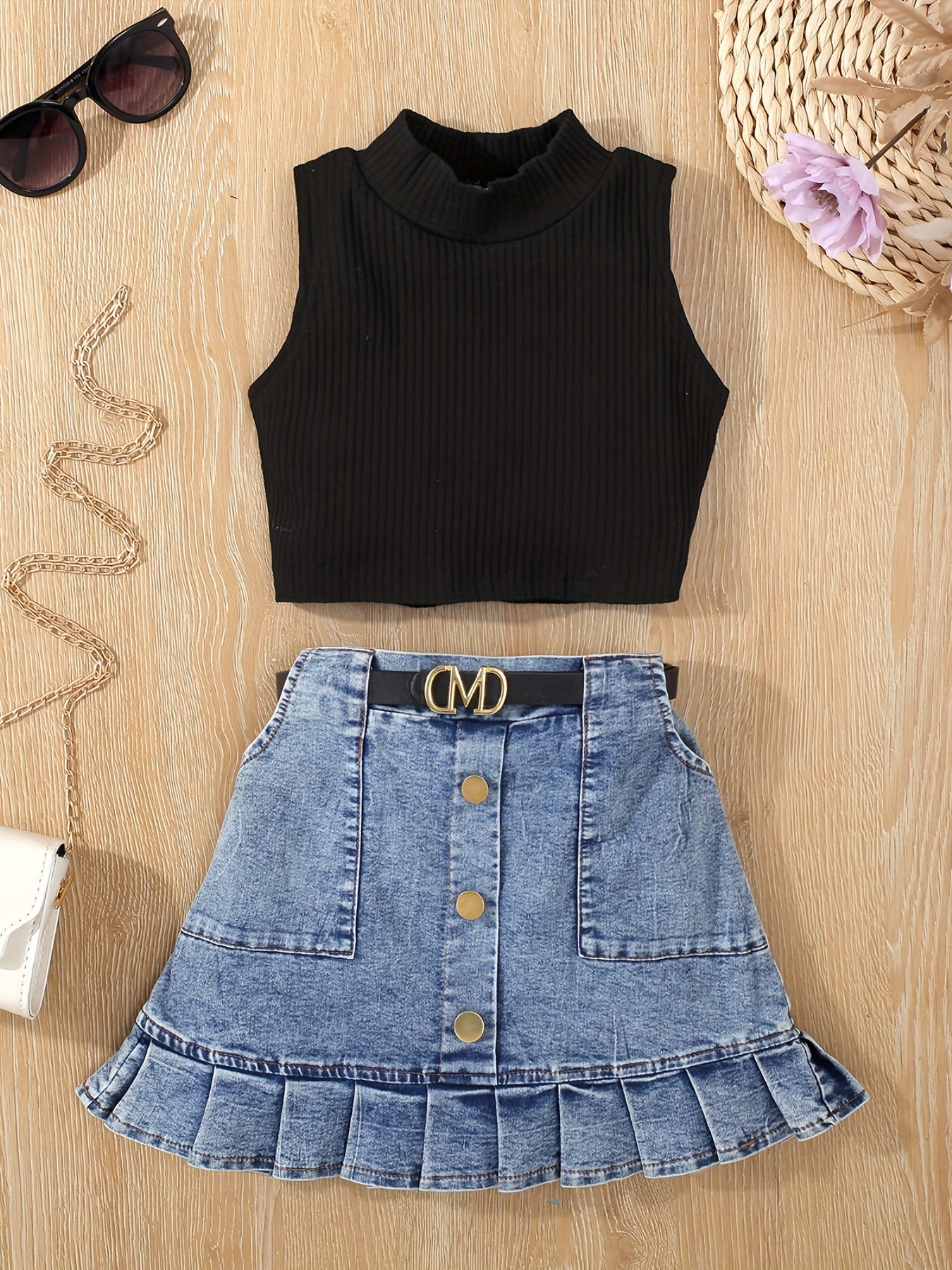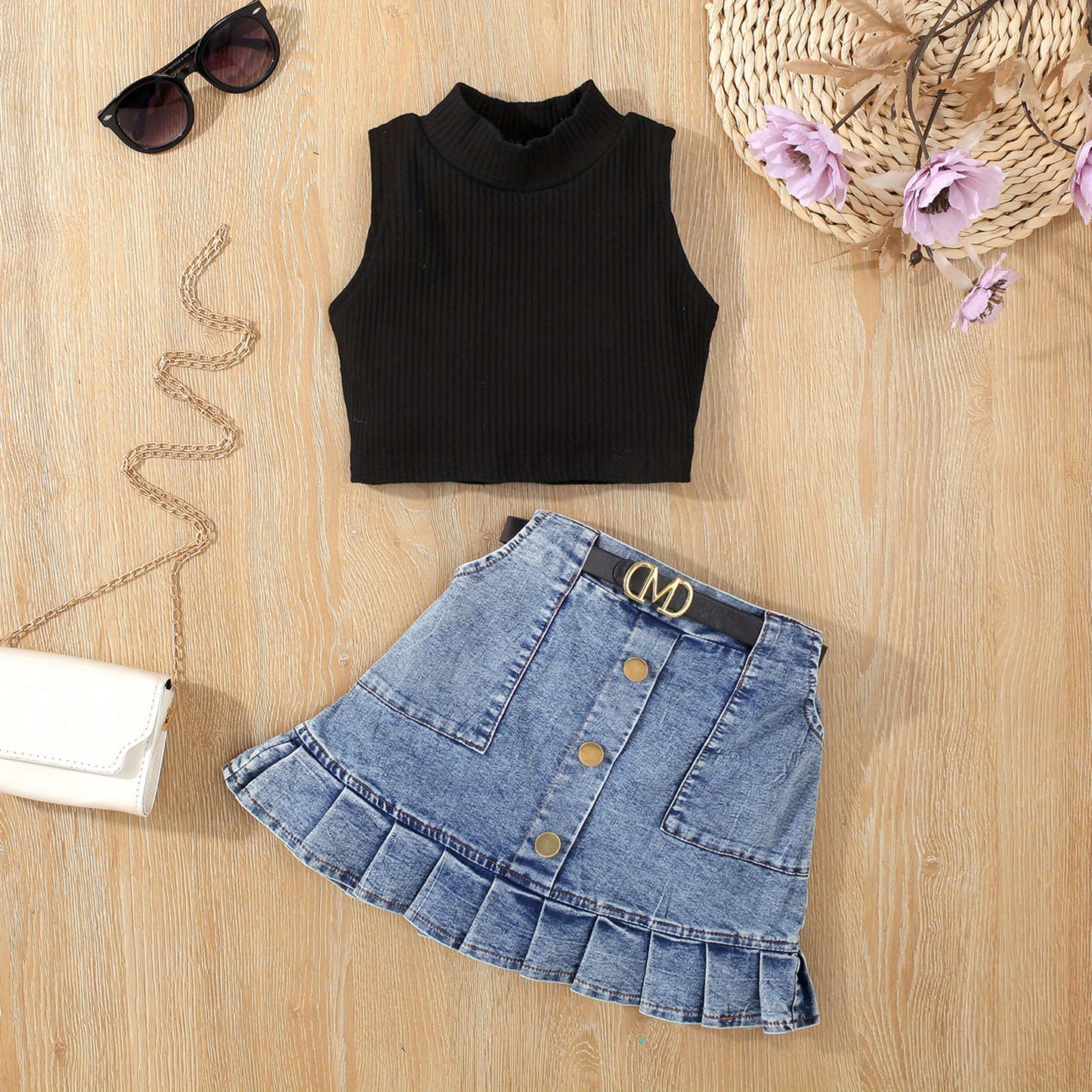 2pcs Toddler Girls Summer Outfit - Skirt Sets with Turtleneck Ribbed Knit Tank Top, Ruffled Hem Pleated Button Belted Denim Skirt, K-pop Inspired, Kids Clothing for Summer Season