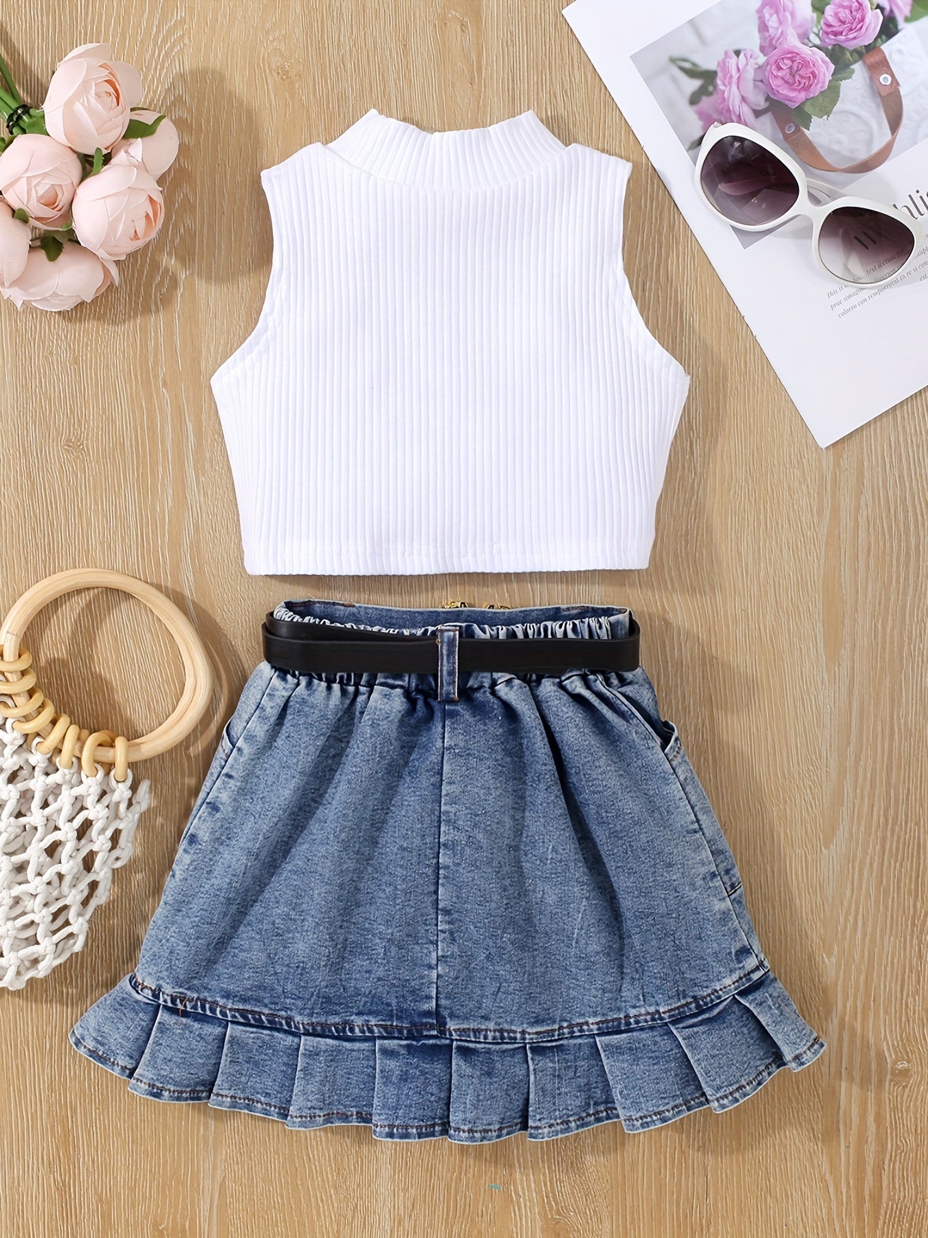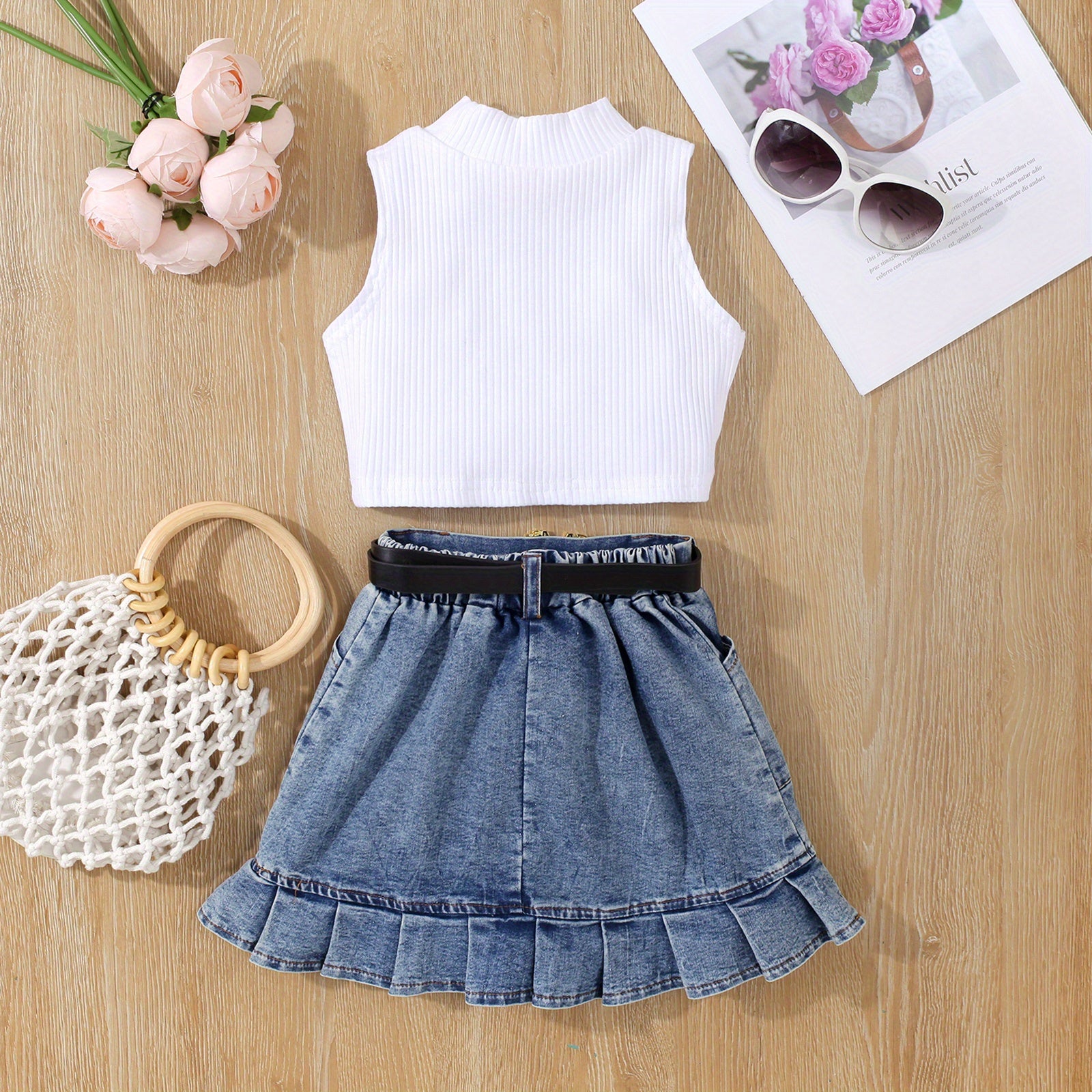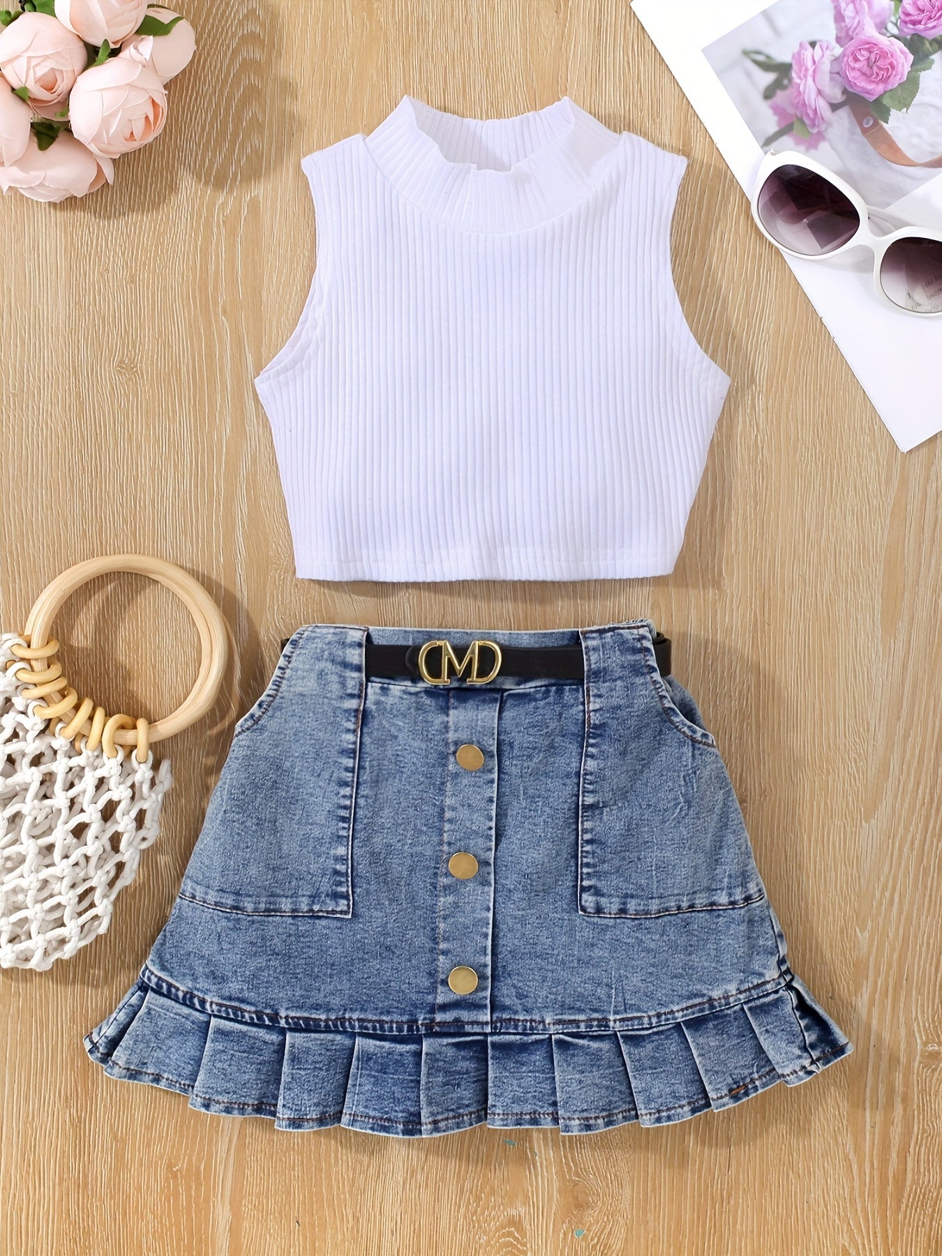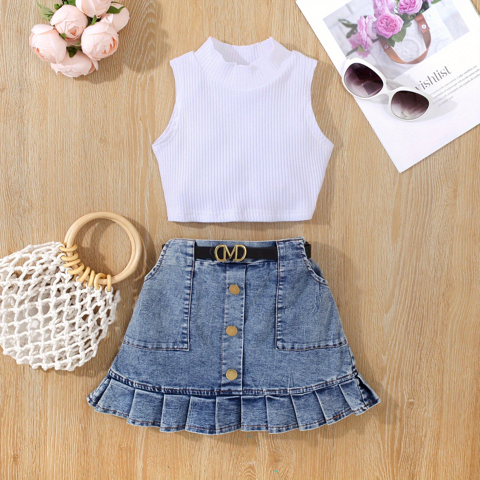 2pcs Toddler Girls Summer Outfit - Skirt Sets with Turtleneck Ribbed Knit Tank Top, Ruffled Hem Pleated Button Belted Denim Skirt, K-pop Inspired, Kids Clothing for Summer Season