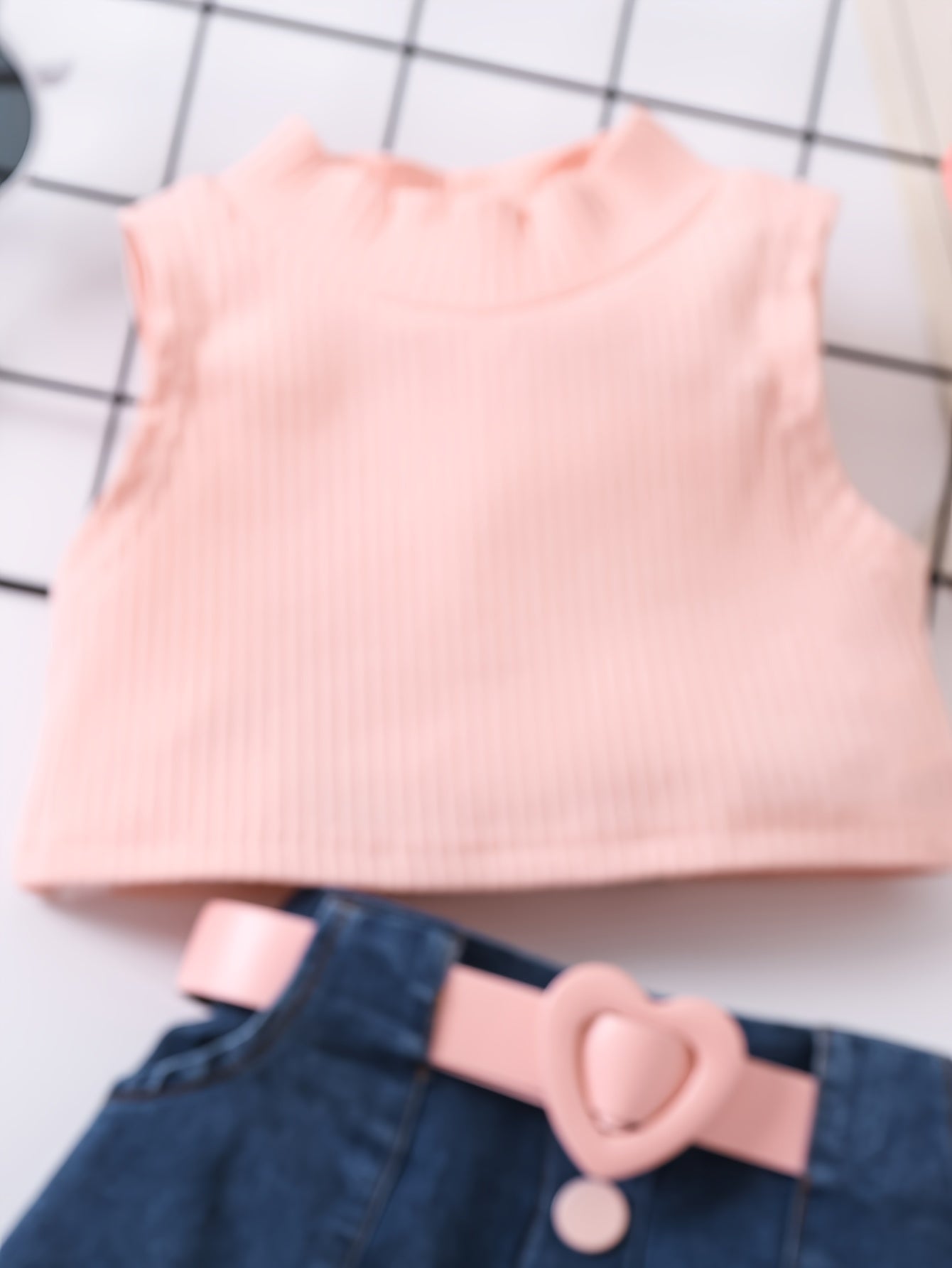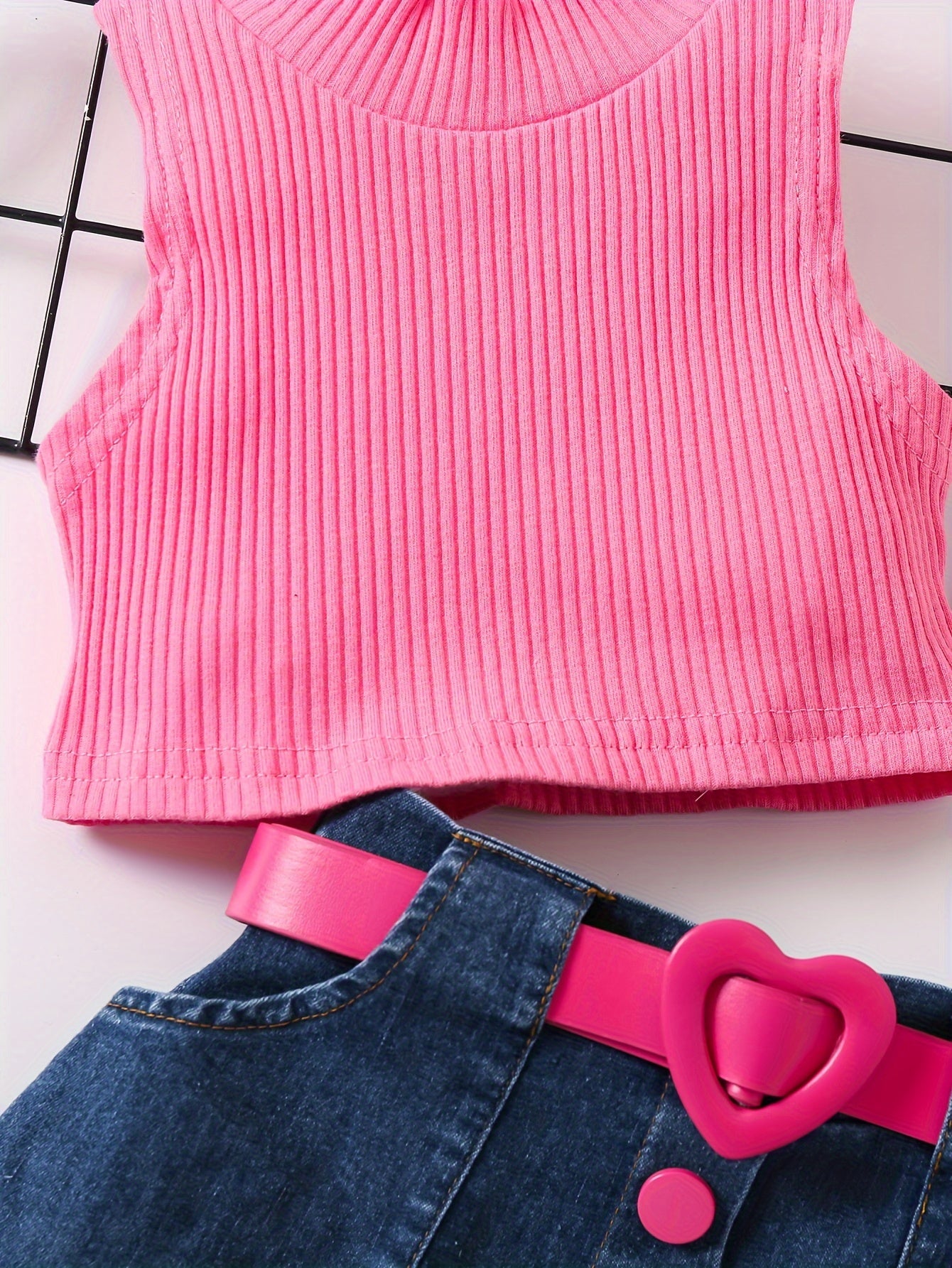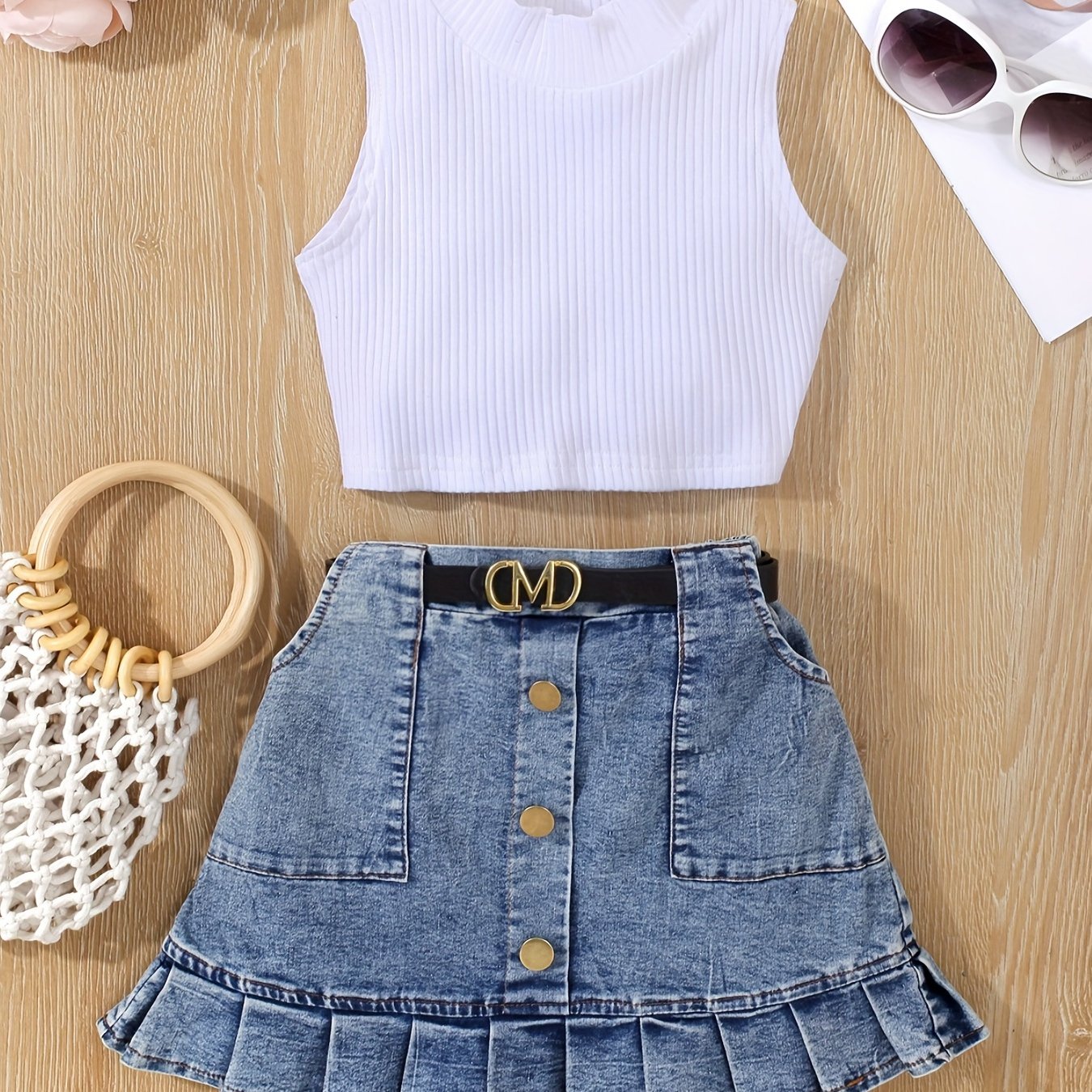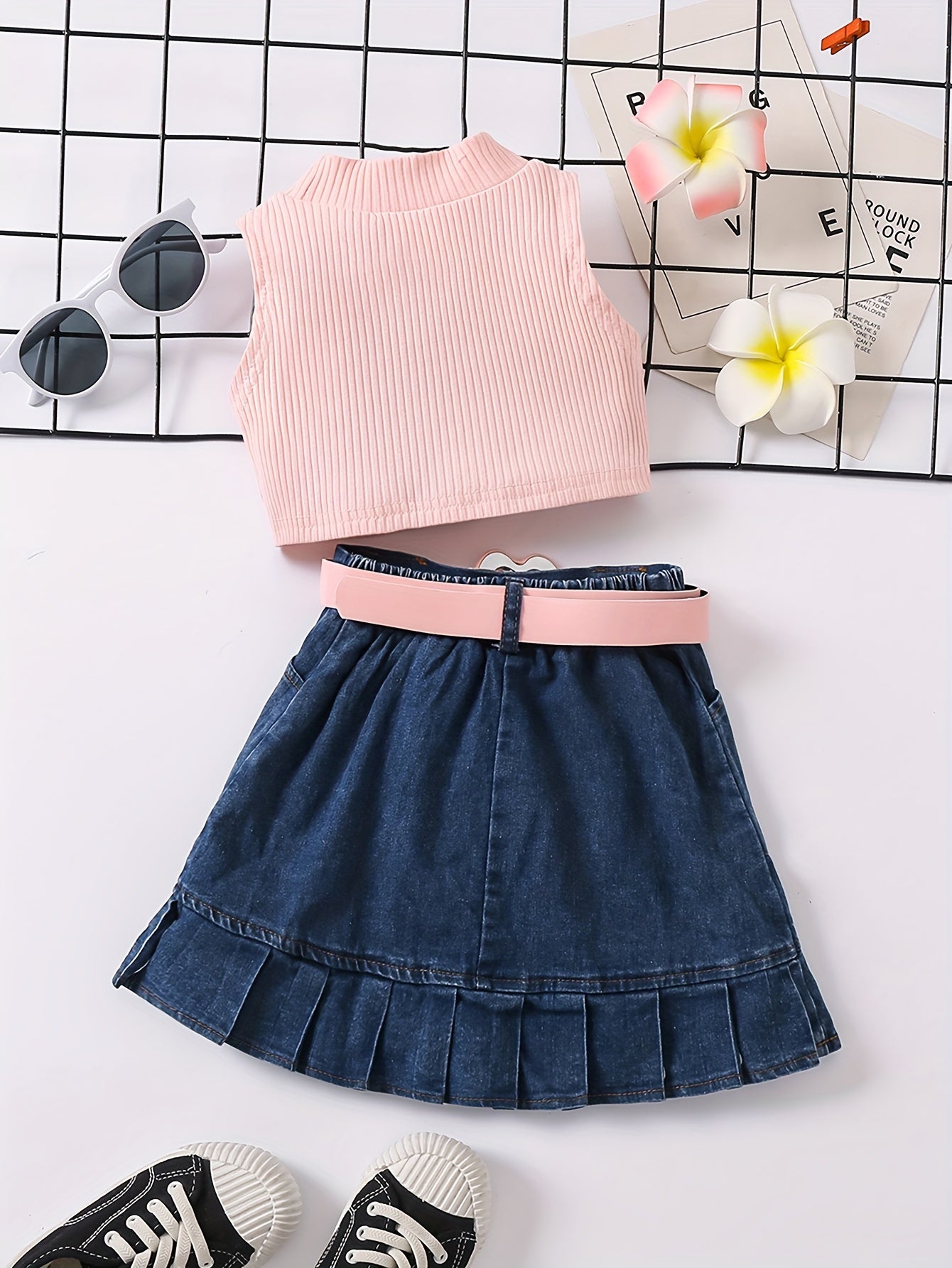 2pcs Toddler Girls Summer Outfit - Skirt Sets with Turtleneck Ribbed Knit Tank Top, Ruffled Hem Pleated Button Belted Denim Skirt, K-pop Inspired, Kids Clothing for Summer Season