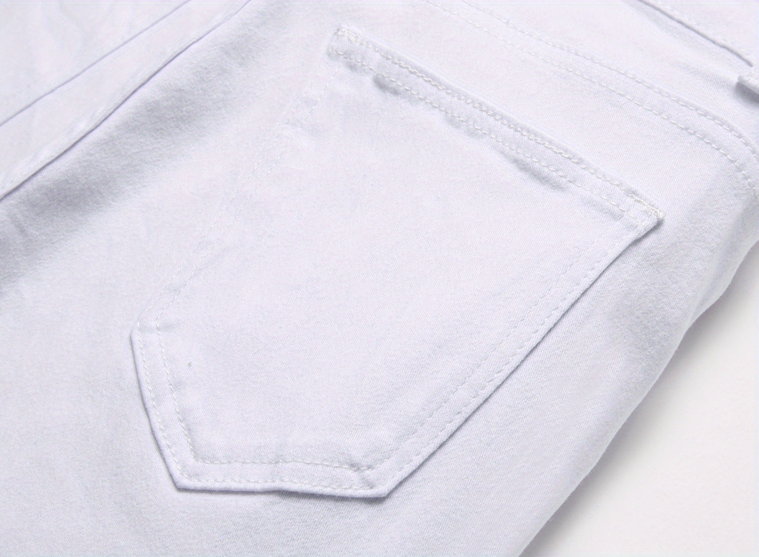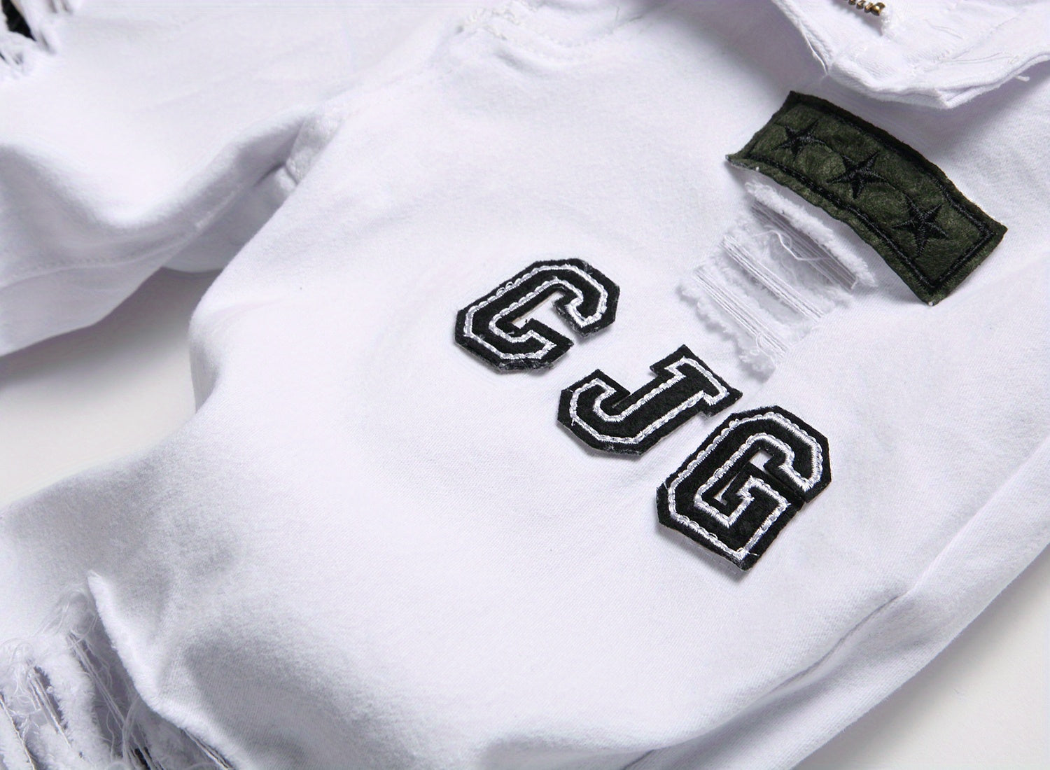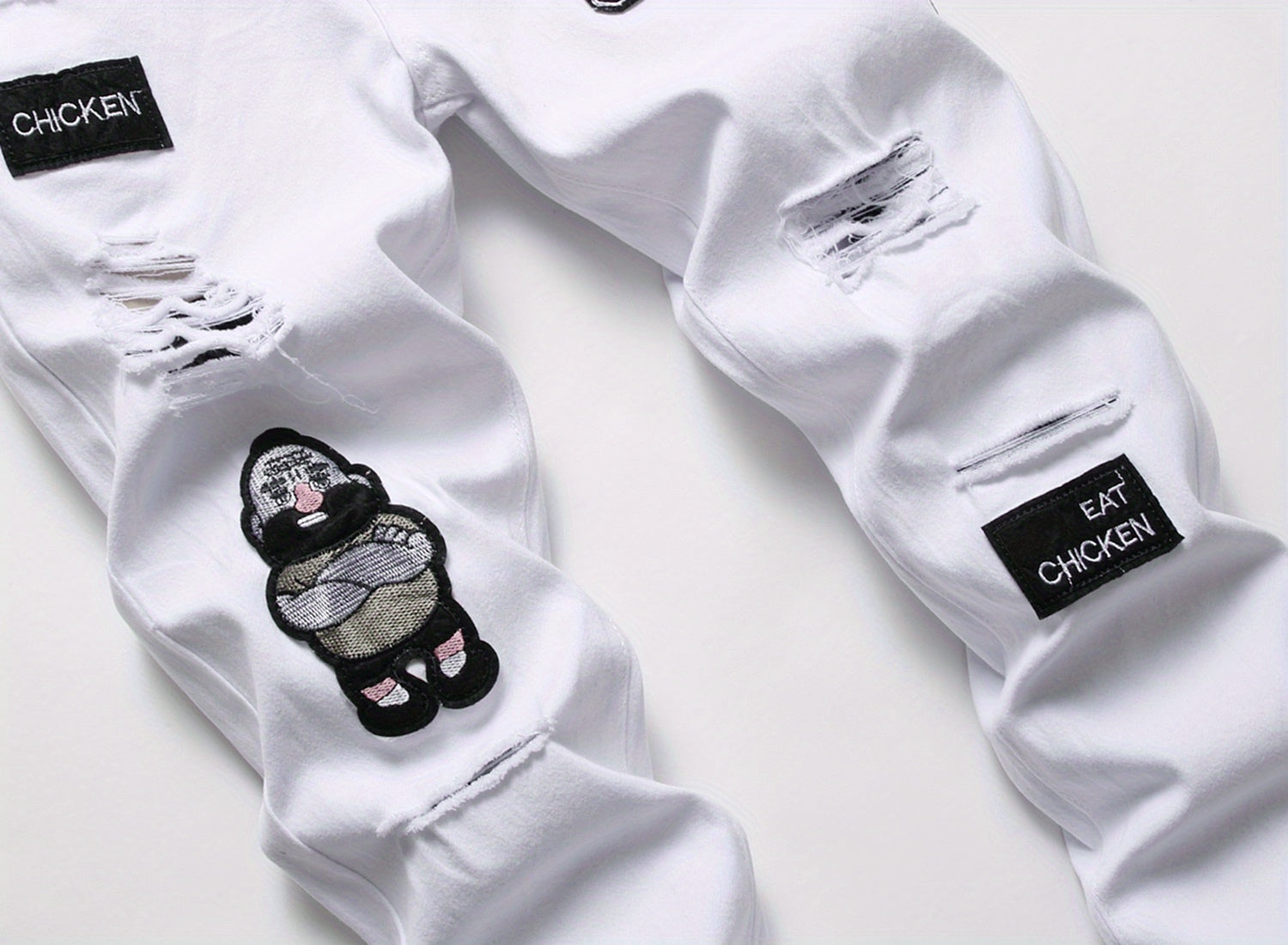Men's Hip-Hop Style Slim Fit Stretch Denim Jeans with Distressed Details, Ripped Badge Accents - Mid-Rise, Raw Hem, Machine Washable, Grey