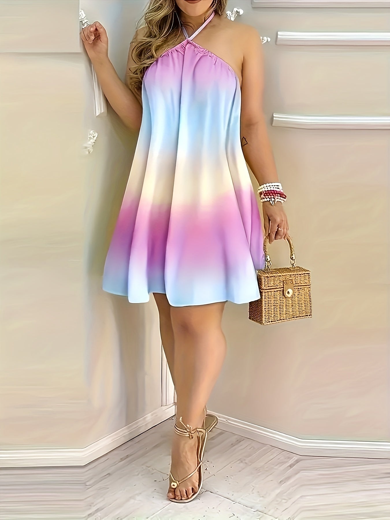 Sexy Floral Print Halter Neck Dress, Boho Backless Halter Dress For Spring & Summer, Women's Clothing