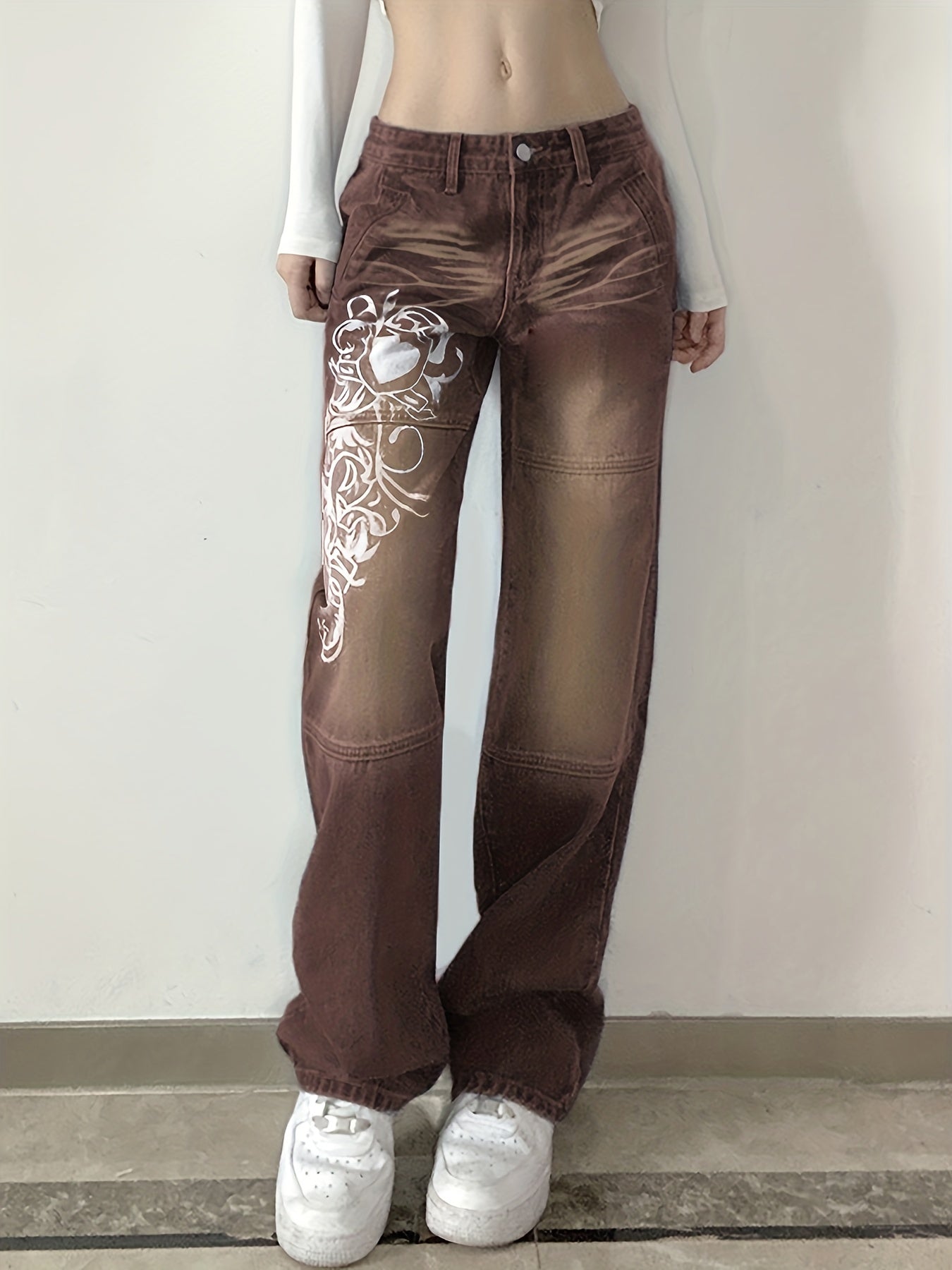 White Floral Print Thigh High Rise Loose Baggy Fit Straight Lets Plicated Hem Sectional Design High Waist Boyfriend Jeans, Women's Denim Jeans, Women's Clothing