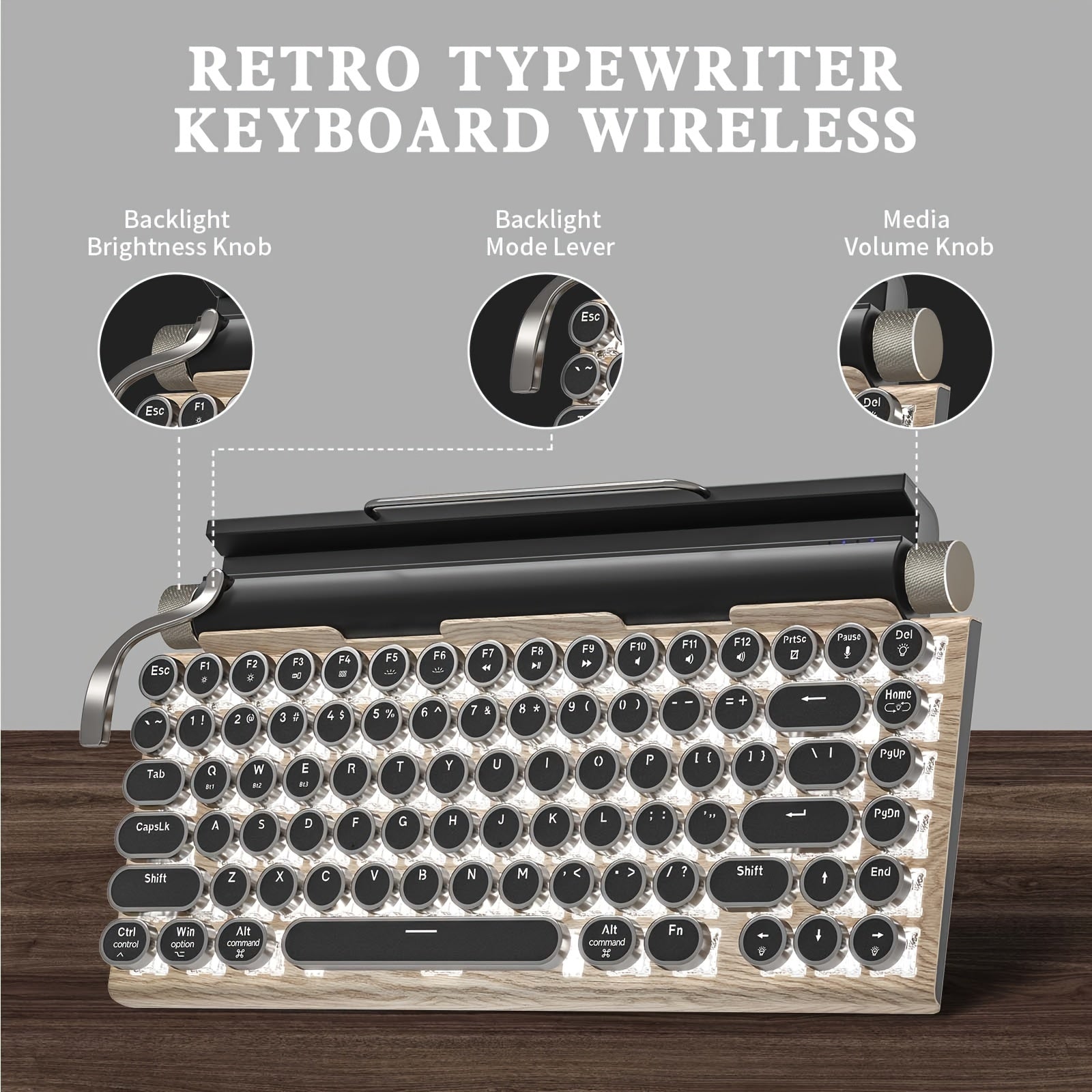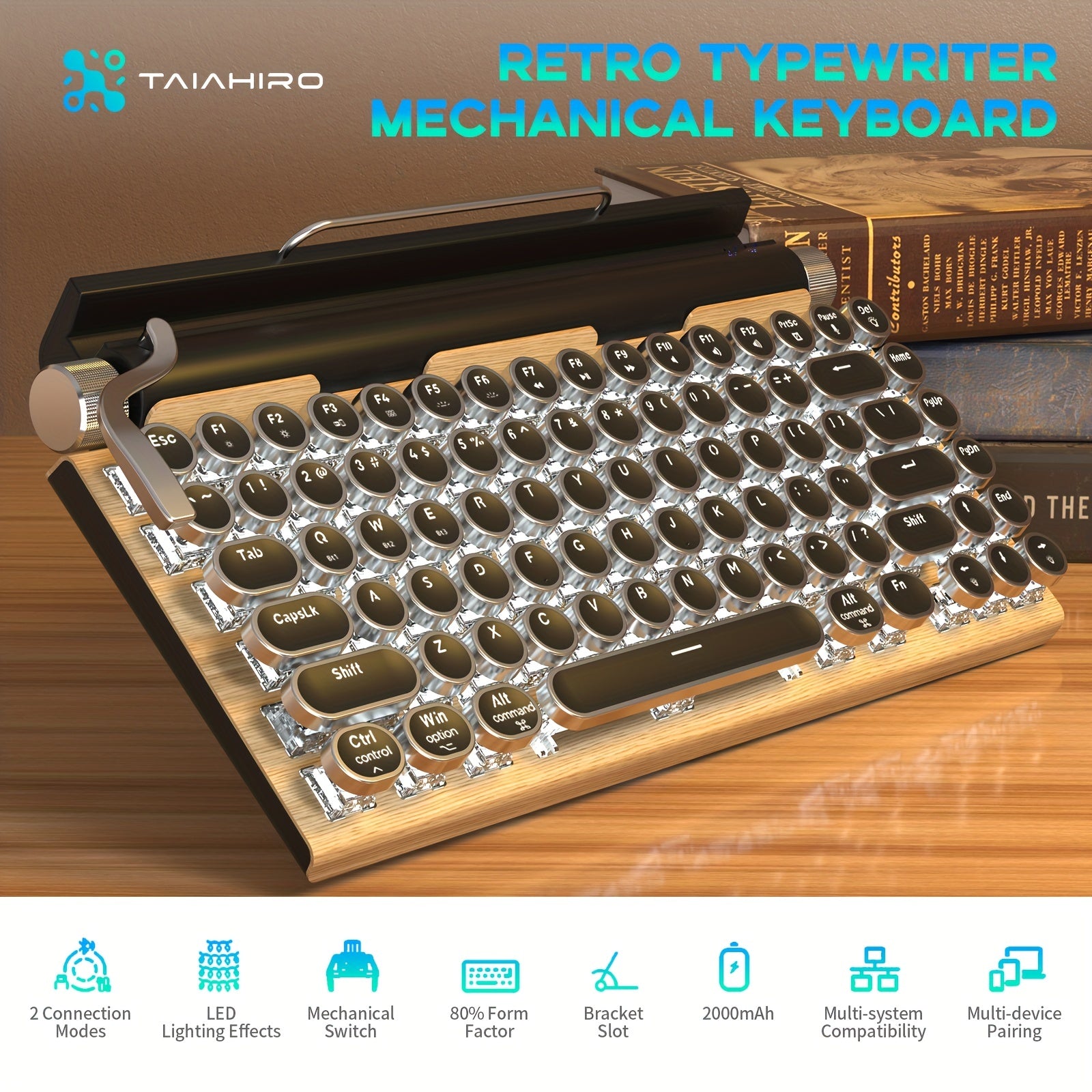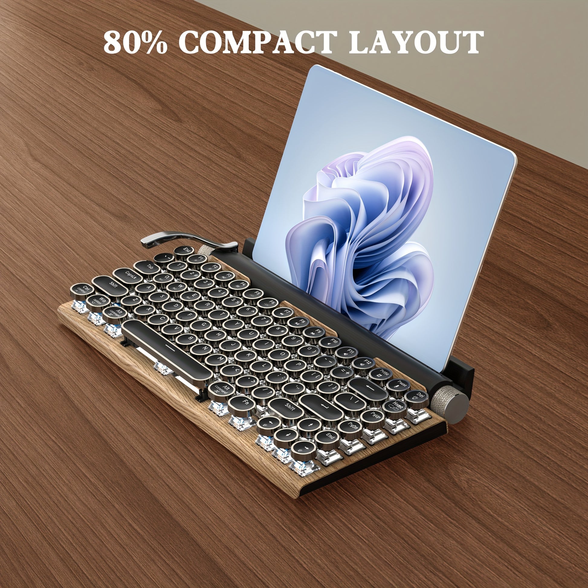 Wired & Wireless Retro Multi-Device Mechanical Typewriter, Compact 80% Layout Keyboard, Hotswappable, Wireless 5.0, Round Keycaps, LED Backlit, For Windows/IOS/Android/Linux